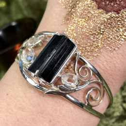 Major protection is the gift and magic of this Black Tourmaline Cuff. Black tourmaline is one of my favorite stones and for good reason. This Root Chakra gemstone offers psychic protection, grounding, shielding, and prevents loss and theft. This cuff features an open back with...