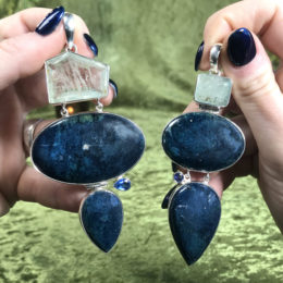These Blue Chalcedony Pendants with Blue Tanzanite feature an open back with a raw blue oval-shaped chalcedony hanging from raw tanzanite, set in .925 silver. Blue chalcedony is known as the forgiveness stone. It helps heal karmic wounds and debts, as well as trauma in...