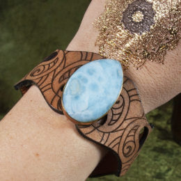 This Larimar Leather Bracelet will connect you to the wisdom of the ancient civilization, Atlantis. This leather bracelet features a large, tear-drop shaped larimar crystal set in 18k gold plated brass. Larimar is referred to as the "Rare blue stone of Atlantis." It's a crystal...